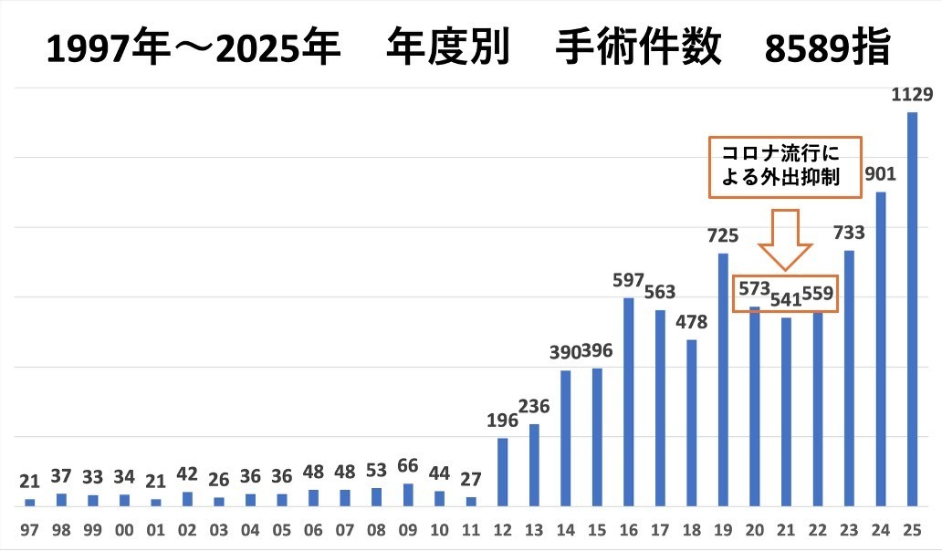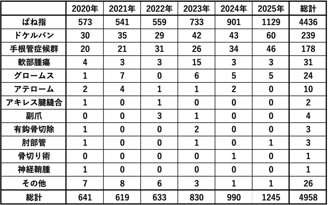 ①手術実績 ばね指:8589(指(1997年―2025年までの累計手術数)