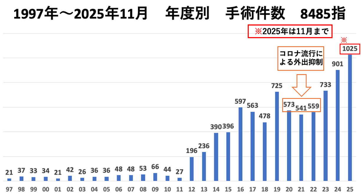 当院では安永式腱鞘切開刀を用いた腱鞘切開術(ばね指手術)を28年間続けており、1997年より統計を取り始めてから2025年11月までの間に、累計8485指の手術を行いました。手術件数は年々増えておりましたが、コロナ感染による外出抑制期間の3年間は減少しました。しかし、規制が解除されてから手術件数は著しく増加しており、昨年度の手術件数は一年間で901指となりました。