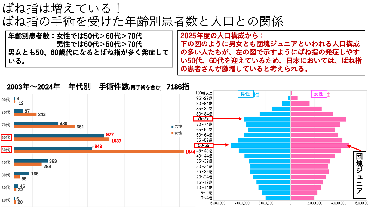 1: ばね指になりやすい年齢層(更年期障害)の増加:当院で手術を受けた年齢別患者数の棒グラフで女性の患者数は50歳以降から激増していました。また男性も50歳代から60歳代にかけて増えておりました。このデーターより患者数が増加していた要因として、性ホルモンの低下(ばね指の発症因子)を起こす50歳以降の人口の変化を調べてみました。総務省人口統計による年齢別人口は、50歳以降、約5800万人と多く、日本の人口の約半数になっていました。また、そのうち800万人いる団塊ジュニア世代が現在50歳代を迎えており、ばね指になりやすい状況の人口が激増していると考えられました。つまり、ばね指になりやすい50歳代、60歳代の年齢層の人口増加がばね指の増加につながっていると考えられました。