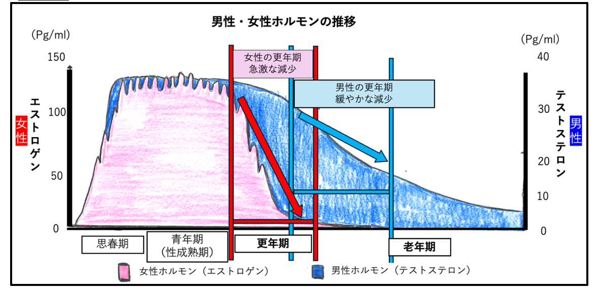 上の図1では年齢(横軸)とエストロゲン(女性ホルモン)(縦軸、左)の関連を表しており45-55歳の更年期でエストロゲンが急減しています。(赤矢印)